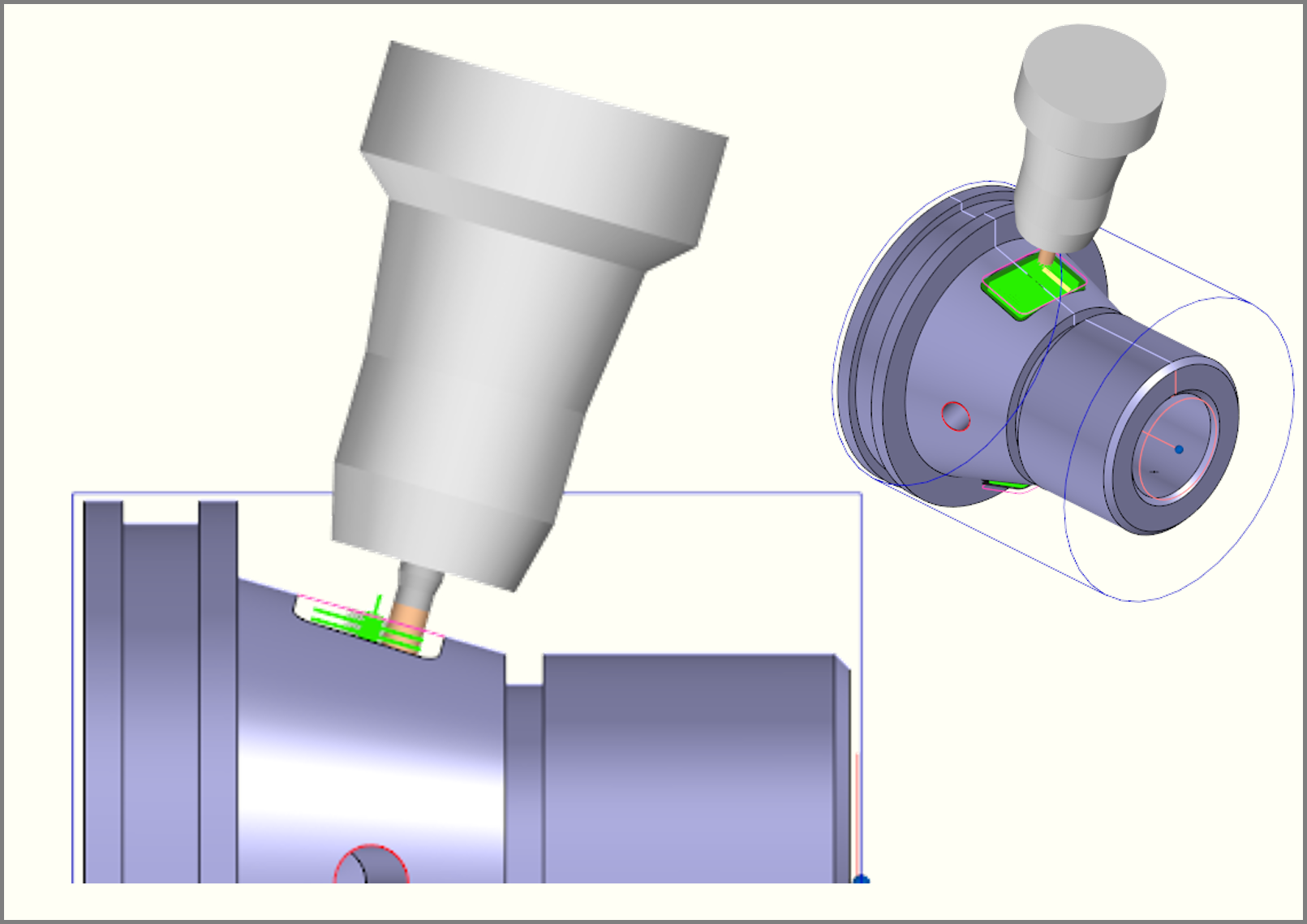 加工軸を任意の方向から定義することで、傾斜軸や旋回軸でワークを位置決めした穴あけ・2軸~3軸による切削加工が可能です。複数面分のNCデータを一度に作成できるため、段取り替え時間や治具加工時間、CAM作業時間を大幅に短縮します。NCデータは傾斜面加工指令もしくは、フィクスチャオフセットに対応しています。