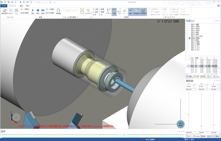 旋削加工において、荒取り・仕上げ・溝切り・ねじ切り・突っ切り・中ぐりなど、NC旋盤に対応した多様な加工プログラムを簡単な操作で作成できます。効率的な加工工程設計をサポートし、生産性と精度の両立を実現します。