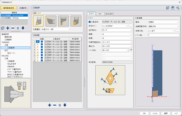 主要メーカの工具とホルダ、およびメーカ推奨の切削条件を参照することが可能です。 また、多段ホルダーやホルダーセットを登録することでより正確な干渉チェックが行えます。カタログデータはウェブからダウンロードして簡単に登録することができます。