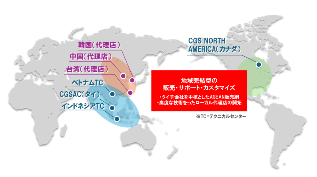 当社グループのCAD/CAM販売の海外子会社は、タイとカナダに拠点あり、また海外サポート拠点として、インドネシアおよびベトナムにテクニカルセンターを設置しております。