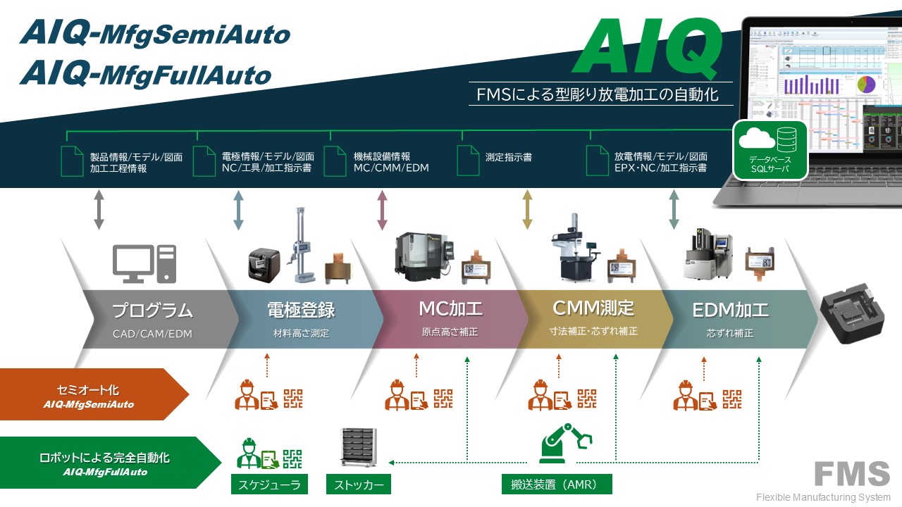 近年、多品種少量生産や個別ニーズへの対応、労働力不足と技術継承、激化するグローバル競争、さらに短納期化や市場変化への柔軟な対応力など、製造現場はかつてない課題に直面しています。こうした背景に加え、放電加工のさらなる合理化ニーズの高まりを受けて誕生したのが、AIQ+FMSによる統合型ソリューション「AIQ-MfgSemiAuto/AIQ-MfgFullAuto」です。